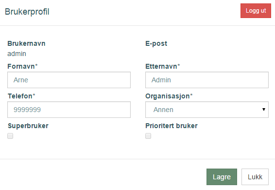 Brukeren kan redigere brukerprofilen ved å logge inn i løsningen og klikke på brukernavn oppe til høyre etter login. ![]()